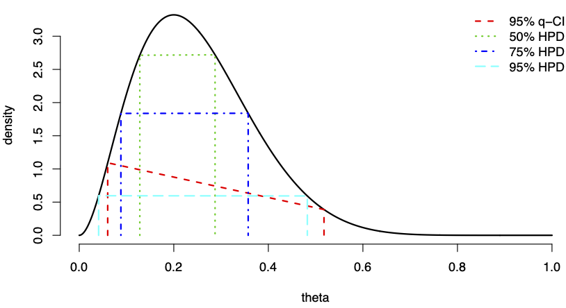 The 95 % HPD region is [0.04, 0.48] which is narrower than the quantile-based CI, yet both contain 95 % probability.