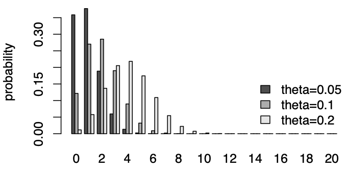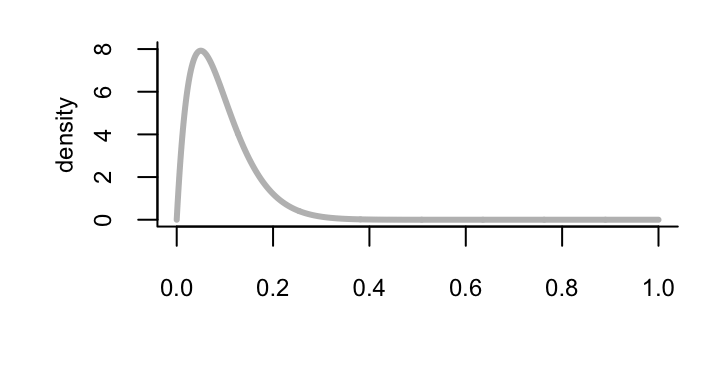 Suppose out of \(n=10\) conditionally independent draws of a binary random variable we observe \(Y=2\) ones (successes).