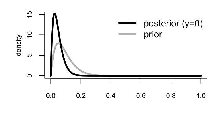 If we don’t find any infections (\(y=0\)) our posterior is: \[ p(\theta |y=0)= \mathrm{Beta}(2, 40) \]