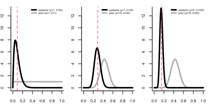The posterior expectation can be written as a weighted average of information from the prior and the data \[ \mathrm{E}\{\theta |Y=y\} = \frac{n}{a + b +n} \bar{y} + \frac{a+b}{a+b+n} \theta_0. \] Thus \(a\) and \(b\) can be interpreted here as prior data where \(a\) is the number of prior successes and \(a+b\) is the prior sample size. When \(n\gg a+b\) most of our information comes from the data instead of the prior.
